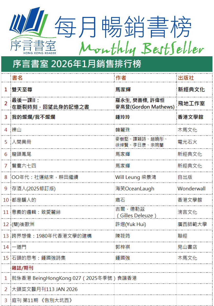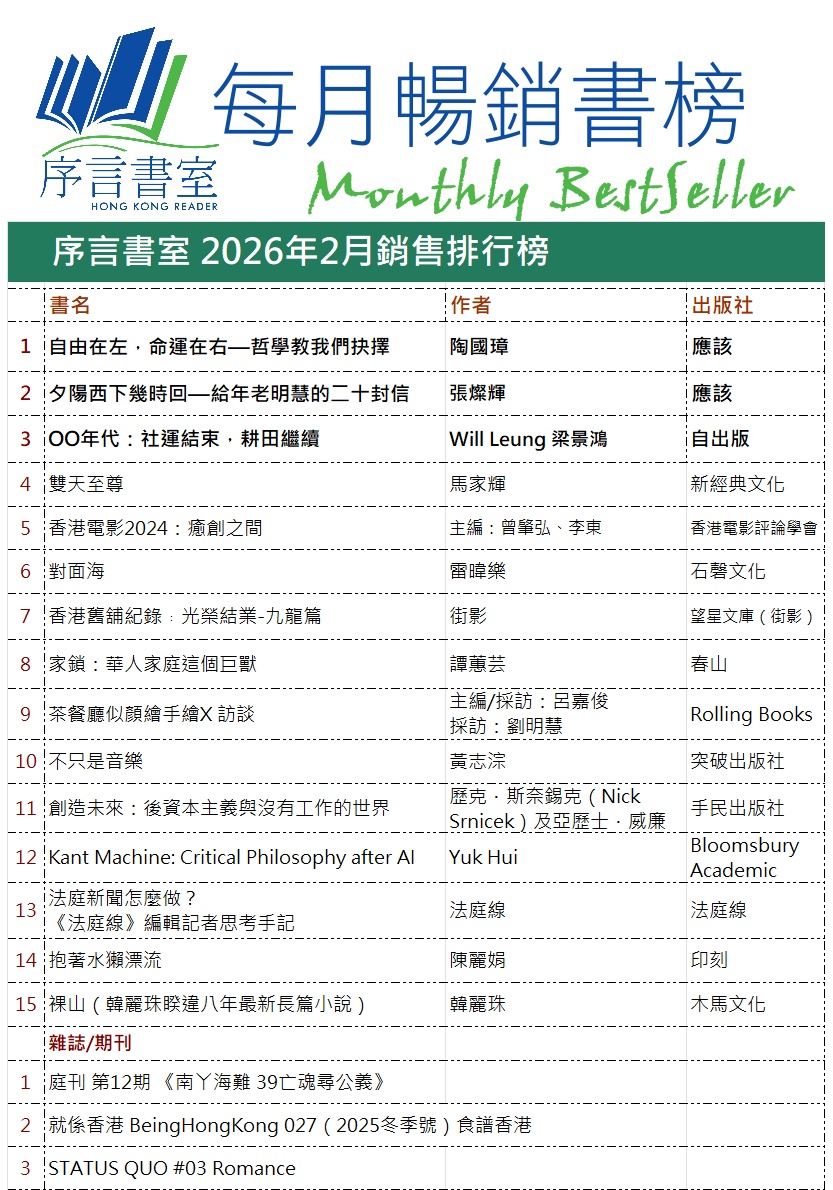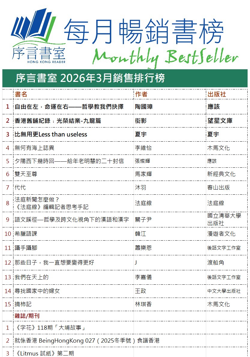 地址︰旺角西洋菜南街68號7字樓 (旺角地鐵站D3/E2出口,GU大電視對面,上兩層有電梯) Address:7F, 68 Sai Yeung Choi Street South, Mong Kok(MTR Exit D3/E2) 地圖MAP 電話/Tel/WhatsApp/Signal︰2395 0031 電郵/email︰info@hkreaders.com 營業時間︰中午12時至晚上10時 Opening Hours: 12pm-10pm Follow序言Facebook Follow序言Instagram 加入序言Facebook Group Like店長未未